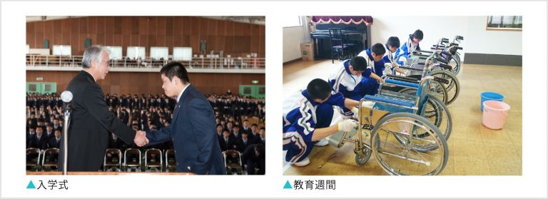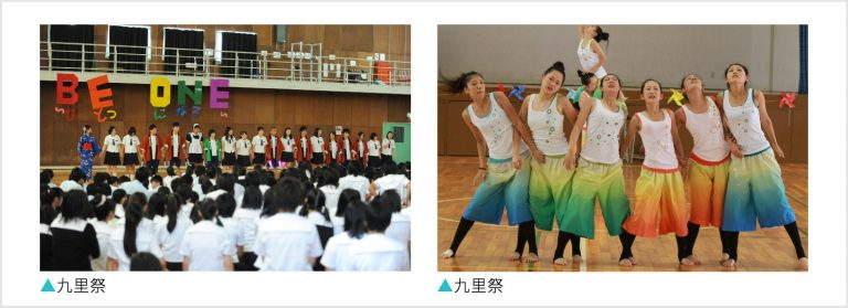 1泊2日での『学年行事』(1年:ボランティア活動 ・ 2年:登山 ・ 3年:庄内旅行)や球技を中心とした『クラスマッチ』、模擬店や発表・展示などが満載の『九里祭』、陸上競技場で行われる『体育祭』、複数コースから選択できる『研修旅行』などなど一年を通して学園行事が満載です。