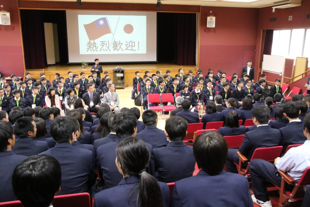 本校生の花道で迎えられた彰化生は満面の笑みを浮かべながら歓迎会場に入りました。歓迎会では生徒会長の高橋君から、「お互いに次世代を担う若者として、手を取り合ってこれからの社会をよりよくしていくための第一歩となるような交流にしましょう」と歓迎の挨拶がなされ、その後本校生の校歌で歓迎を表しました。また、彰化生の代表から、「九里での交流が今回の旅行の一番の楽しみであり、とても素晴らしい経験にワクワクしている。そして、日台の懸け橋となるような交流にしたい」との挨拶をいただきました。