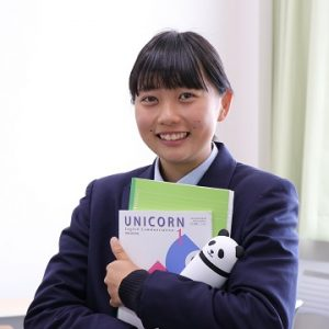 中学生の頃より科目が増え内容も濃く日々大変ですが、クラスの仲間と励まし合いながら楽しく授業を受けています。また、このコースはグローカルという授業があり、世界の貧困などについてとても詳しく学びます。私は将来、貧困に苦しんでいる子供達を救うなどの仕事に関わりたいと考えています。そのためには、まず英語を学び、さらにコミュニケーション力を身につけるのが今の目標です。文武両道を実践するのは大変ですが、クラスの仲間と切磋琢磨し、助け合いながら充実した高校生活を送っています。